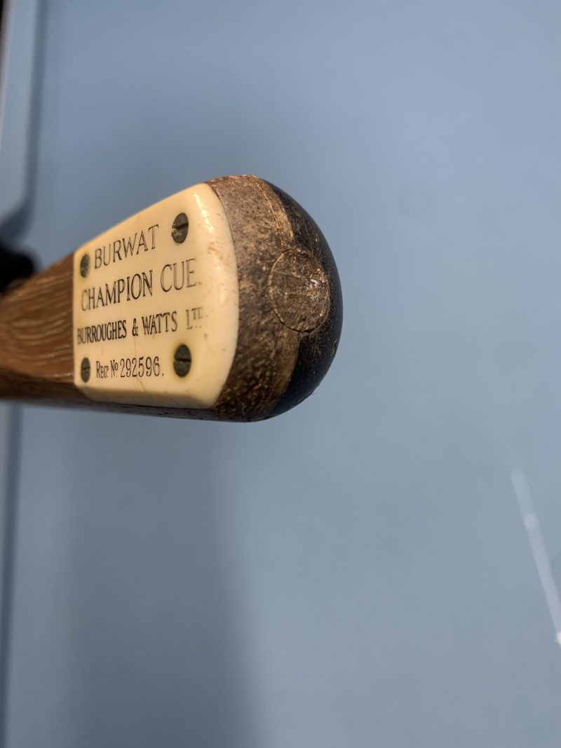 The Burwat Champion was the result of experimentation by the cue makers during the 1890s and the design was first registered in 1895/6. It proved to be one of the most popular cues that Burroughes & Watts ever sold.