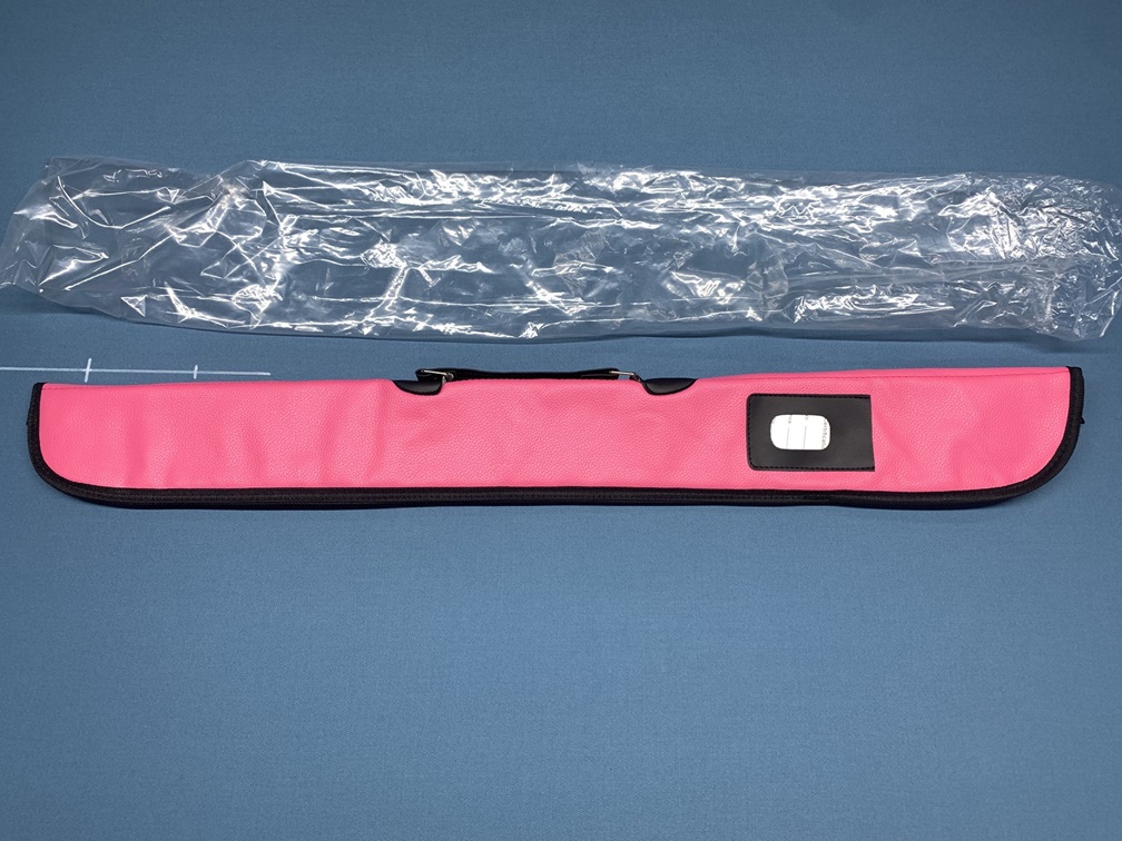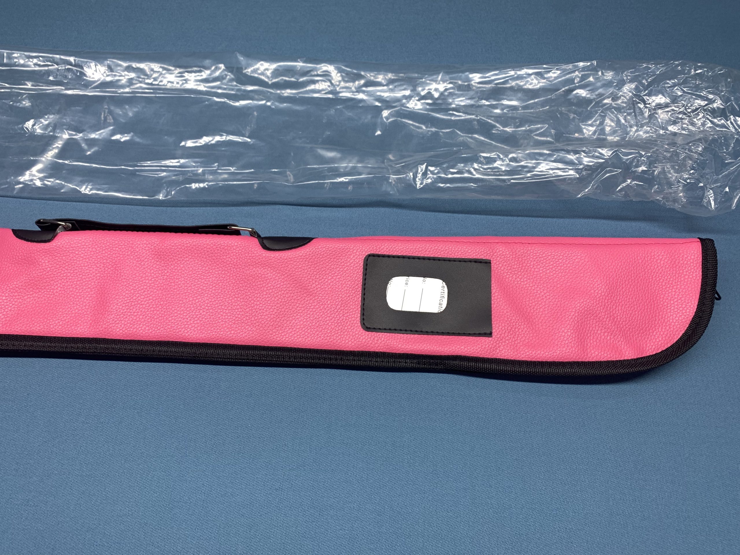 A hot pink vinyl soft cue case with padding designed to protect the cue and provide a suitable carrying solution.