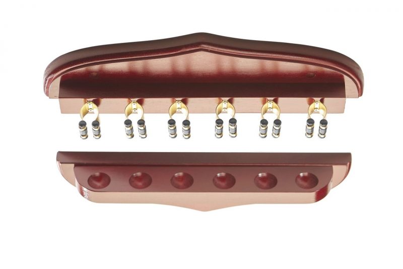 This wall mounted mahogany coloured cue rack can accept up to six cues.